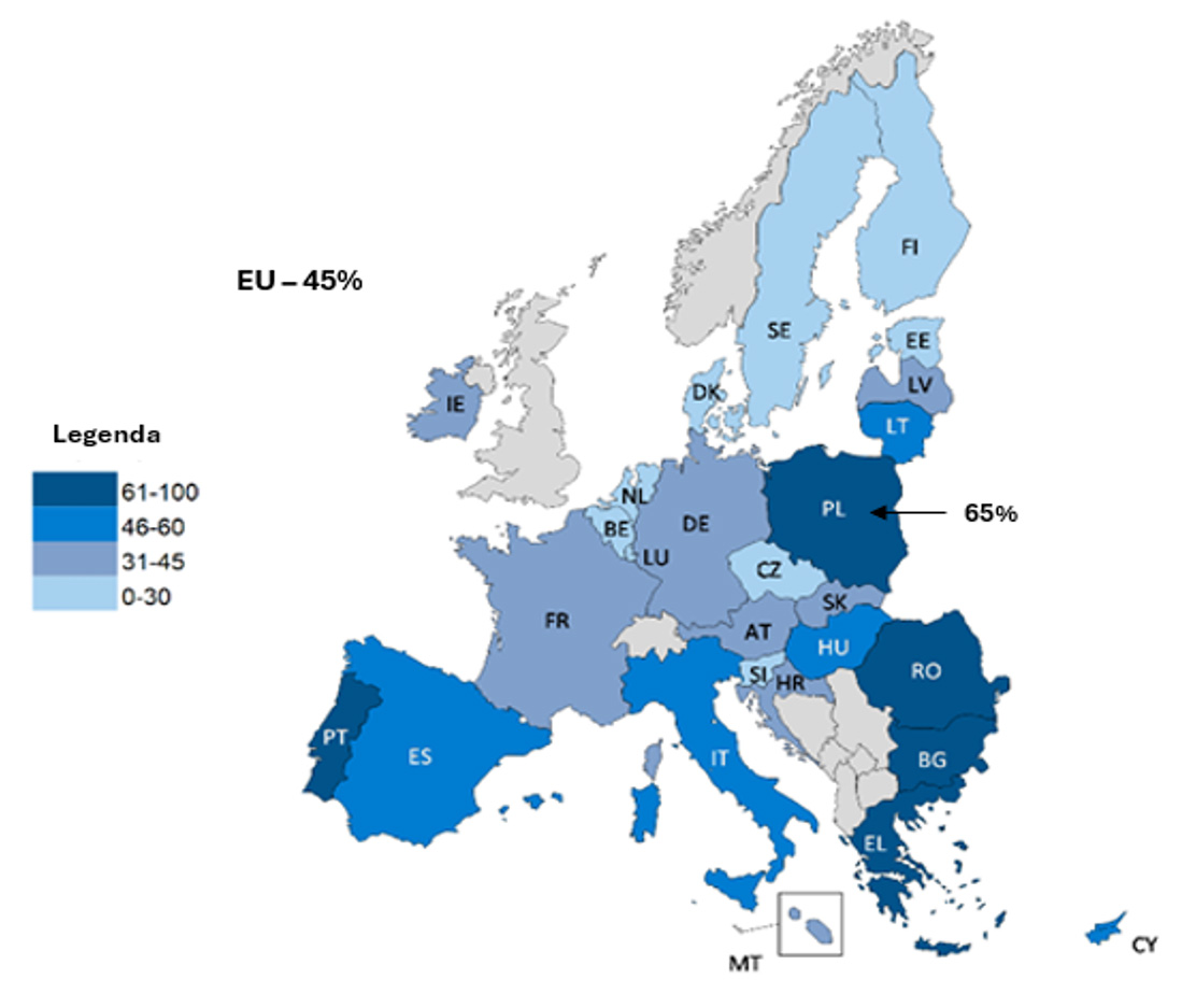 Rycina 1. Odsetki mieszkańców krajów Unii Europejskiej, którzy deklarowali, że nigdy nie ćwiczą i nie uprawiają sportu (2022 r.)