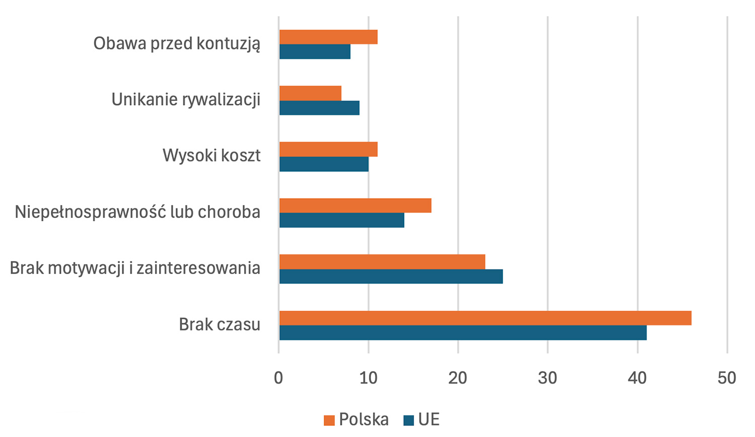 Natomiast najczęściej wymieniane przez mieszkańców UE, w tym również respondentów z Polski przyczyny uniemożliwiające bardziej regularne uprawianie aktywności fizycznej to: brak czasu (odpowiednio: 46% i 41%) i brak motywacji lub zainteresowania takim sposobem spędzania czasu (odpowiednio: 25% i 23%) (Rycina 4).