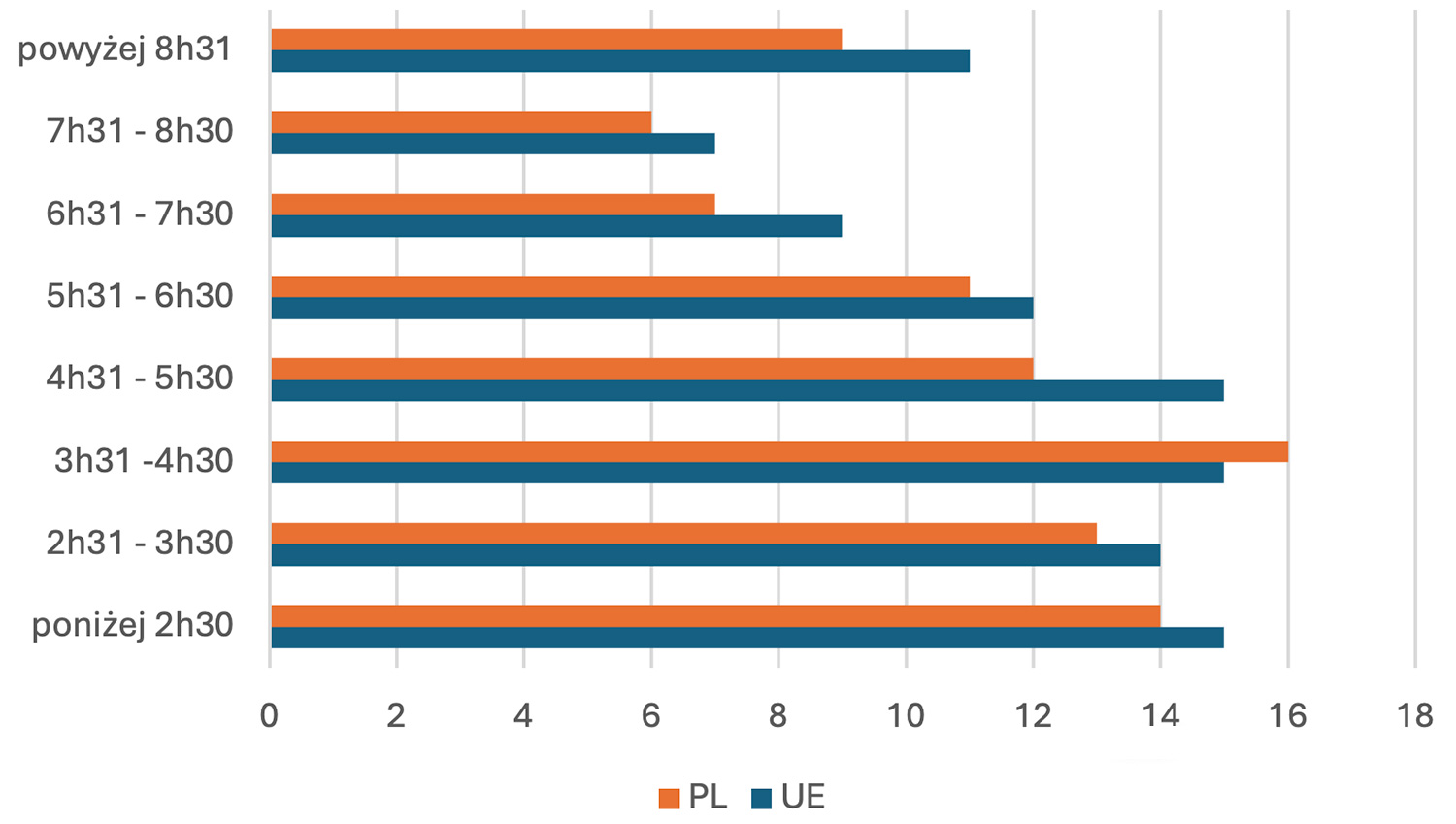 Analizy pokazały też, że 27% mieszkańców UE (22% Polaków) spędzało przeciętnie ponad 6,5 godziny dziennie w pozycji siedzącej (włączając w to m.in. czas spędzany przy biurku, spotkania ze znajomymi, oglądanie telewizji), natomiast 44% (43% Polaków) spędzało w tej pozycji do 4,5 godziny dziennie (Rycina 2).