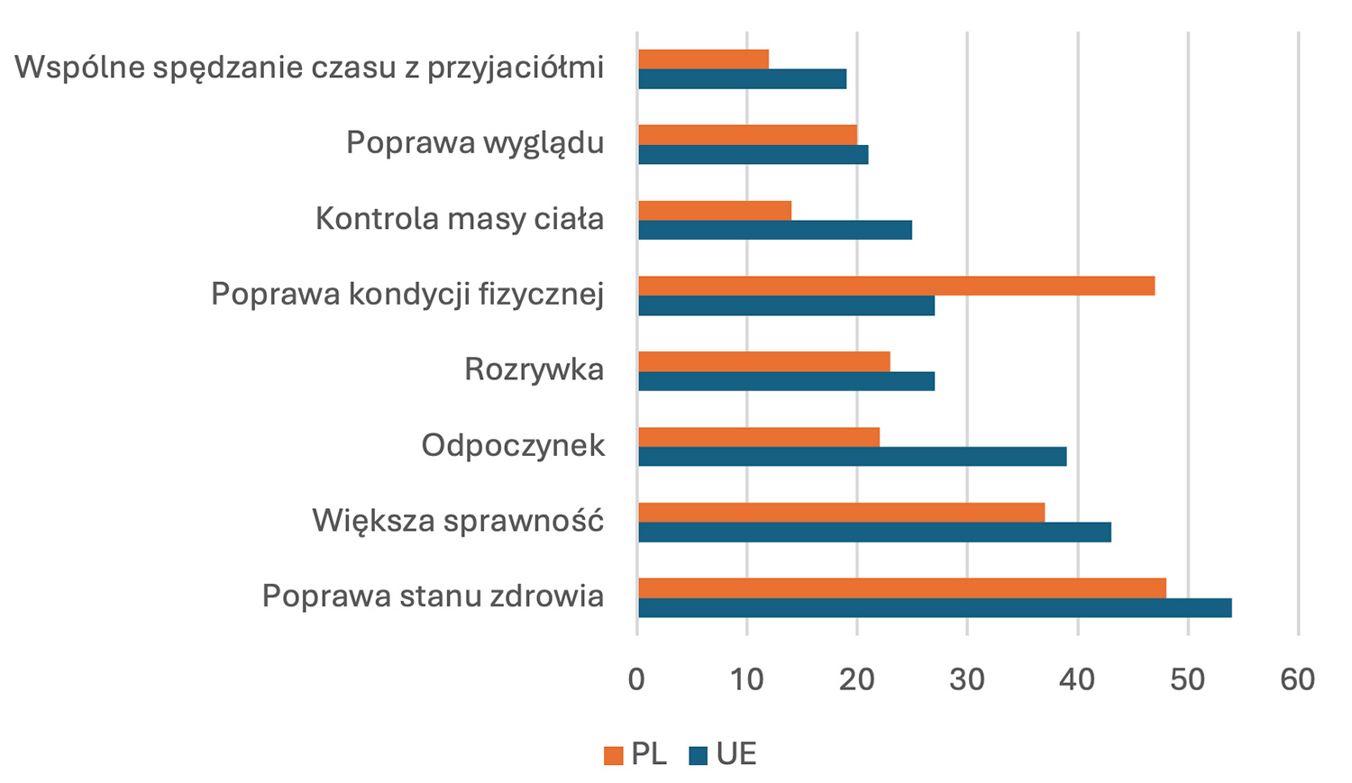Wśród najczęstszych przyczyn podejmowania aktywności fizycznej mieszkańcy UE deklarowali chęć poprawy zdrowia i sprawności fizycznej (odpowiednio: 54% i 43% respondentów), nieco rzadziej odpoczynek (39%), poprawę kondycji fizycznej (27%) i rozrywkę (27%). Podobnie niemal połowa Polaków deklarowała najczęściej jako przyczyny aktywności fizycznej: poprawę stanu zdrowia i kondycji fizycznej (odpowiednio 48% i 47%), a co piąty przyznał, że podejmowanie ćwiczeń wiąże się z rozrywką (23%) lub odpoczynkiem (22%) (Rycina 3).