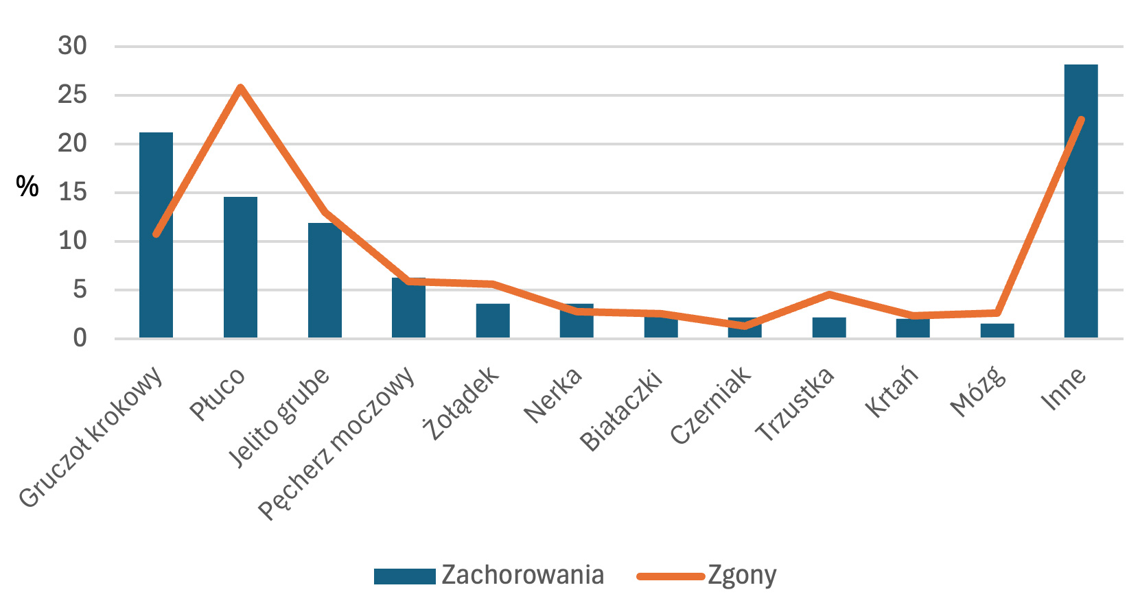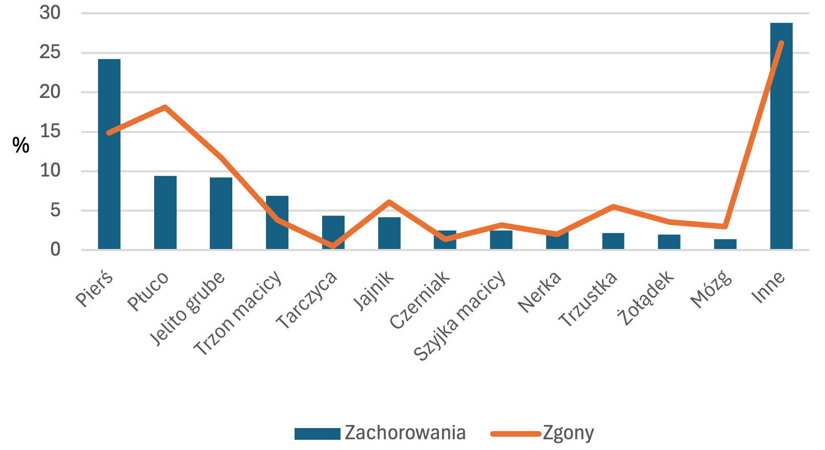 Wśród mężczyzn największy odsetek zgonów dotyczył nowotworów złośliwych płuca (25,8%), jelita grubego (13%), gruczołu krokowego (10,8%), pęcherza moczowego (5,9%) i żołądka (5,6%). Natomiast wśród kobiet najczęściej notowano zgony z powodu raka płuca (18,1%), piersi (14,9%), jelita grubego (11,7%), jajnika (6,1%) i trzustki (5,5%).