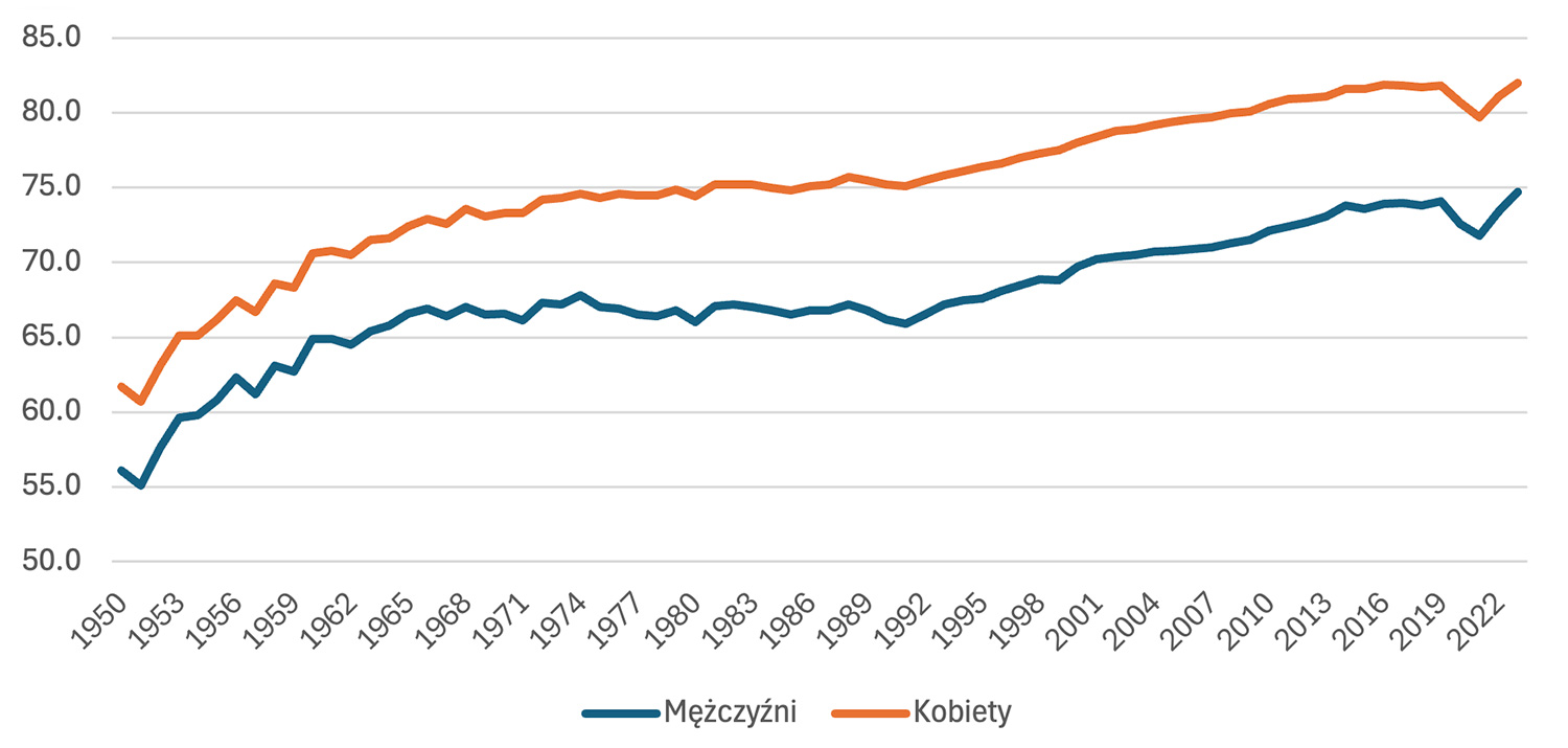 Zmiany długości życia Polaków w latach 1950–2023